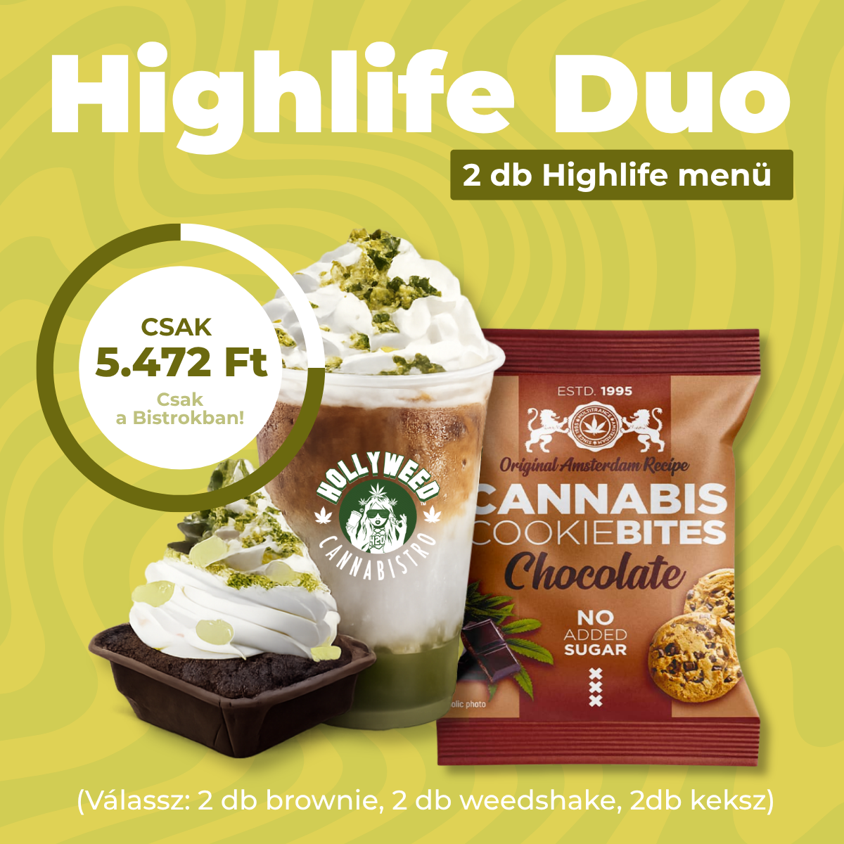 Helyben vagy elvitelre szóló Highlife Menü Duo kupon ajánlat a Hollyweed Cannabistro kávézókban.